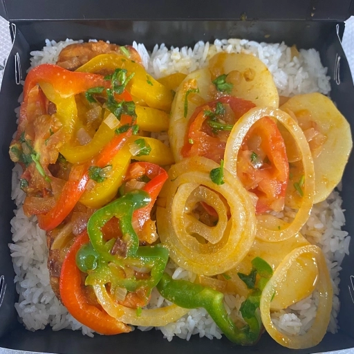 Filé de peixe cozido com rodelas de batata, cebola, pimentão (verde, amarelo e vermelho), tomate e regado com leite de... Ver completo