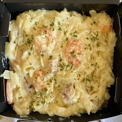 Fettuccine ao molho carbonara de camarão, feito com gema de ovo, parmesão, creme de leite e bacon crocante.