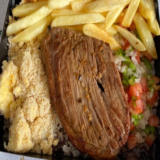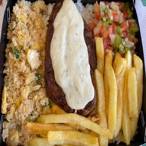 Delicioso bife de picanha no ponto certo, suculento, acompanhado da clássica farofa de ovo. O sabor é equilibrado com ... Ver completo