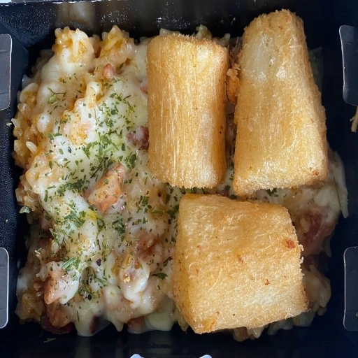 Arroz soltinho misturado com calabresa, bacon crocante e carne seca, tudo gratinado com uma camada generosa de queijo de... Ver completo