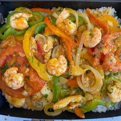 Filé de peixe, camarão e batatas em rodela, cozidos no leite de coco e temperos frescos, com rodelas de cebola, piment... Ver completo